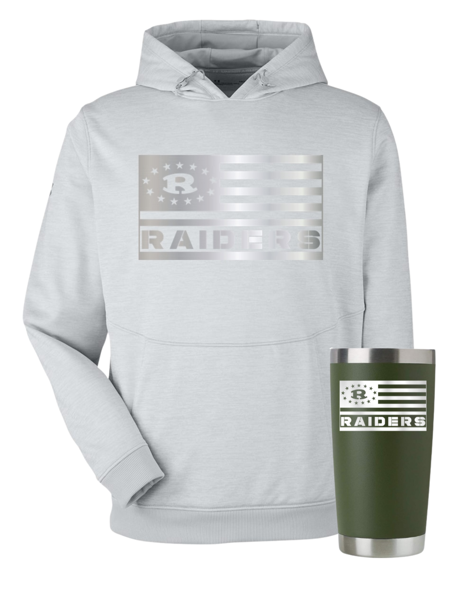 Mod Gray UA Storm Fleece Hoodie + 20 oz Stainless Steel Tumbler in Army Green